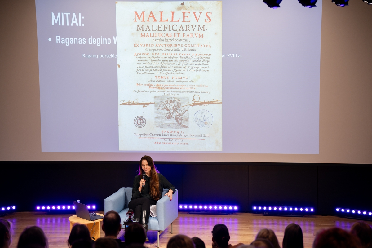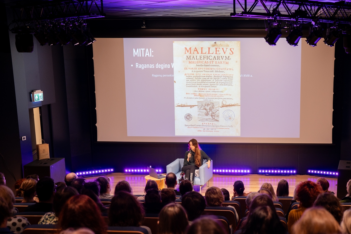 „Kalbėdami apie raganas dažnai nueiname į popkultūrą, o pačias raganas įsivaizduojame kaip puskvailes moteriškes. Tačiau nevalia pamiršti, kad šita istorija – tai šimtai, dešimtys, kiti priskaičiuoja net šimtą tūkstančių likimų, kurie buvo negrįžtamai sužlugdyti, – K. Petrauskė savo pasakojimą bibliotekoje pradėjo mitais apie raganas ir jų paneigimu. – Moteris už raganavimą Bažnyčia persekiojo Viduramžiais. Šiame trumpame sakinyje yra net trys istoriniai mitai, kurie itin plačiai įsigalėję mūsų istorinėje vaizduotėje.“