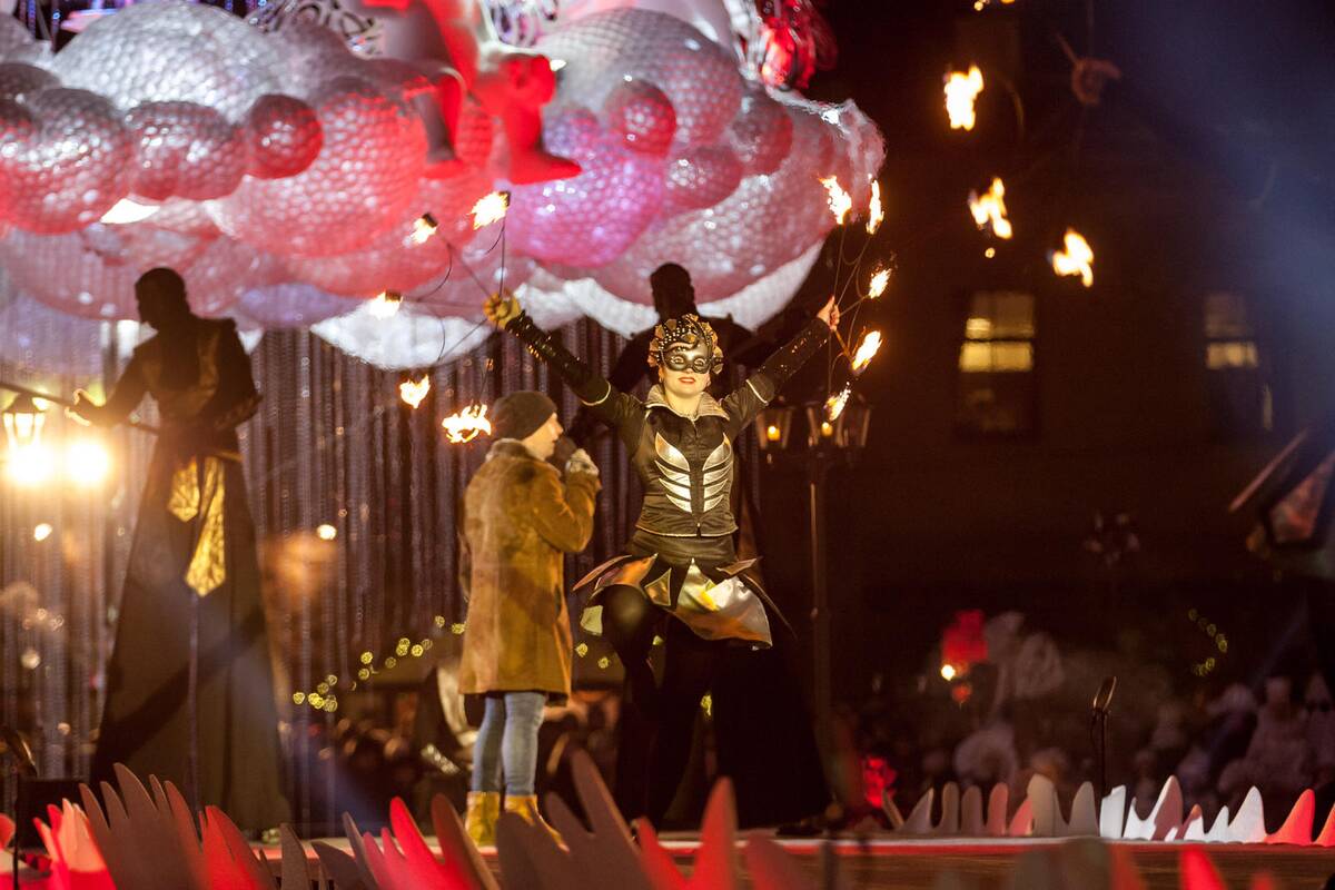 Po eglės nušvitimo, kuri buvo įžiebiama per tris kartus (iš pradžių debesys ir žvaigždė, po to lemputės ir galiausiai visa eglė su angelais), nuskambėjo Kauno ir Norvegijos Vestfoldo apskrities sveikinimai, tęsėsi žibintininko ir balso iš dangaus pokalbis bei koncertas.