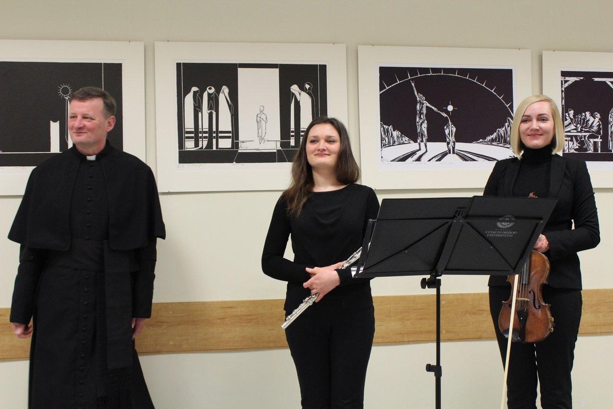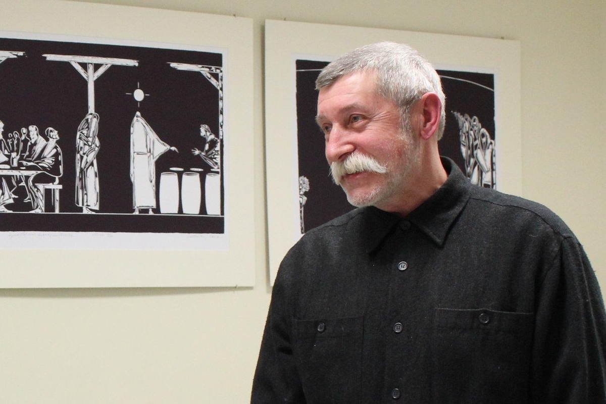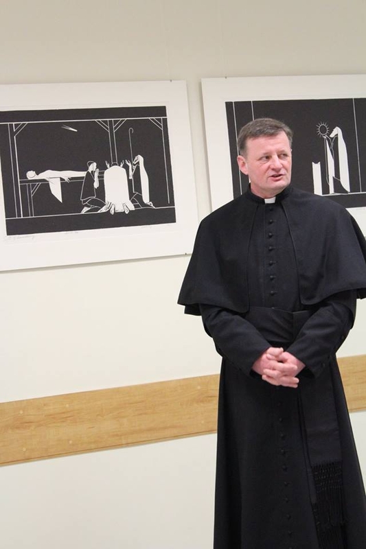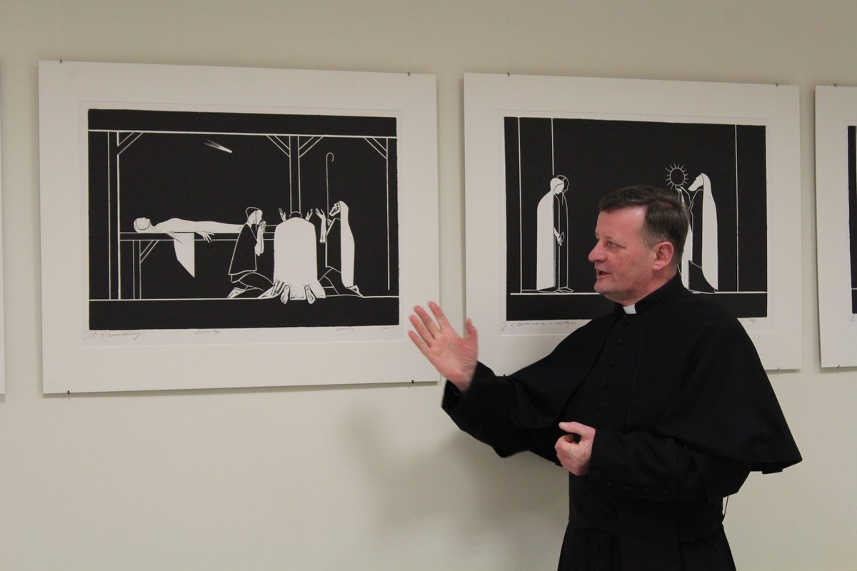Menininko darbus raiškiai ir įtaigiai, nuspalvindamas sodraus balso intonacijomis, pristatė parodos kuratorius – kunigas Virginijus Veprauskas. Jis priminė, kad šio amžiaus pradžioje popiežius Jonas Paulius II paskelbė naujus Šviesos slėpinius. Šiuos penkis Rožinio slėpinių darbus parodos autorius kūrė 2017 m.