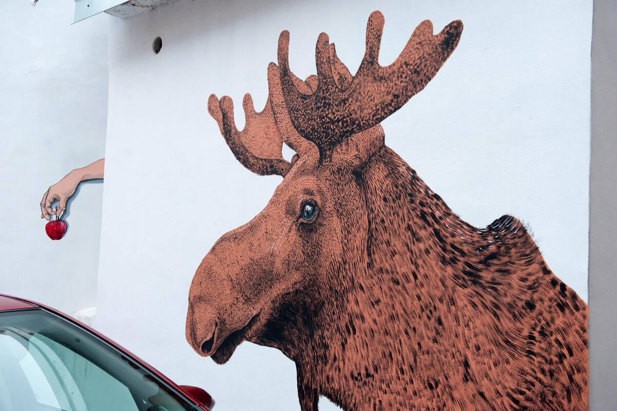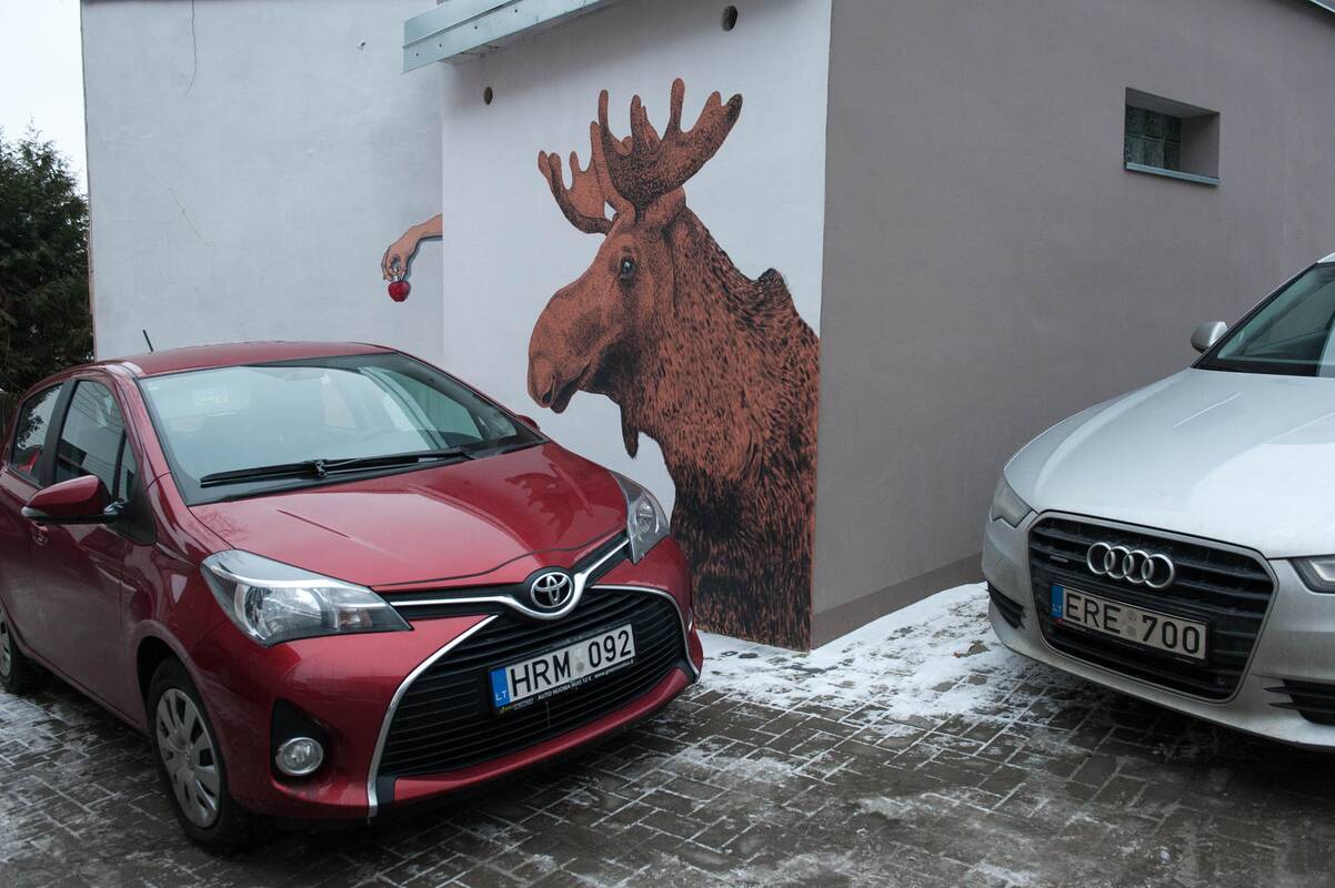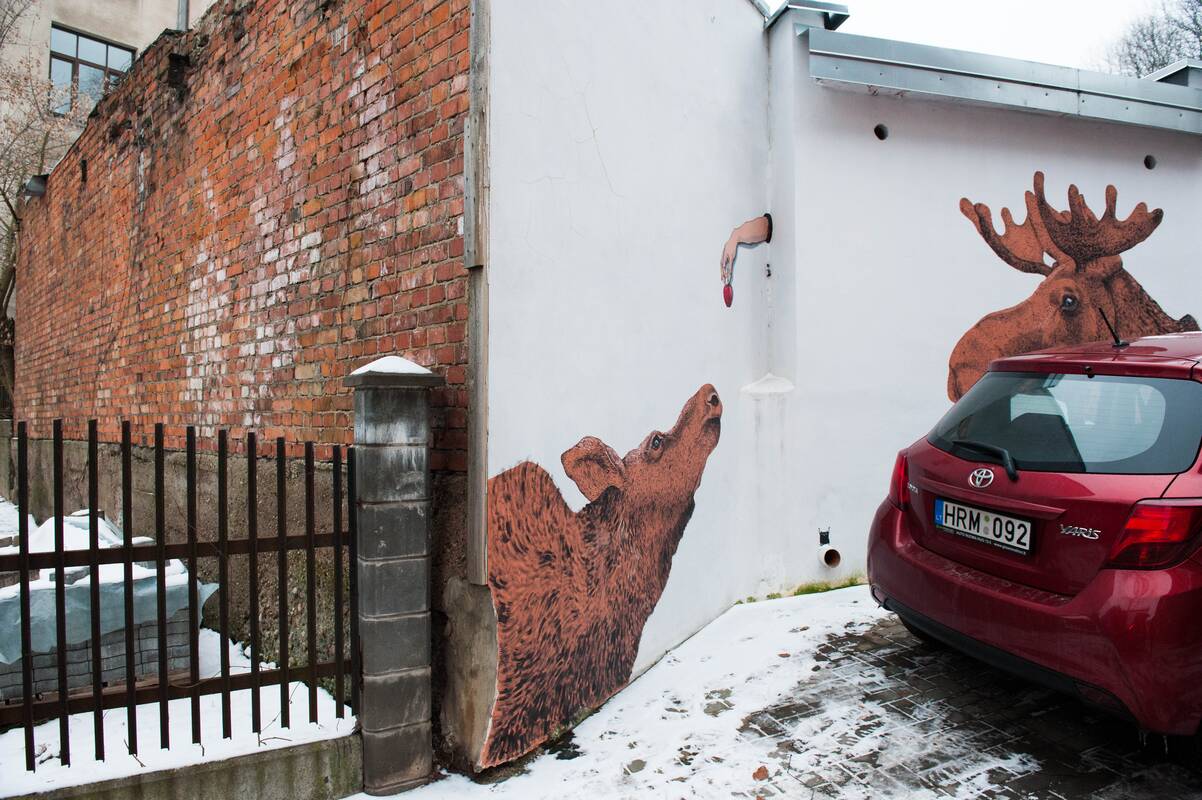 Kauniečiai dalijasi nauju piešiniu, kuris papuošė Parodos kalno kiemą. Ant ūkinės paskirties pastato sienos atsirado briedžiai, kurie skanauja raudoną obuolį.