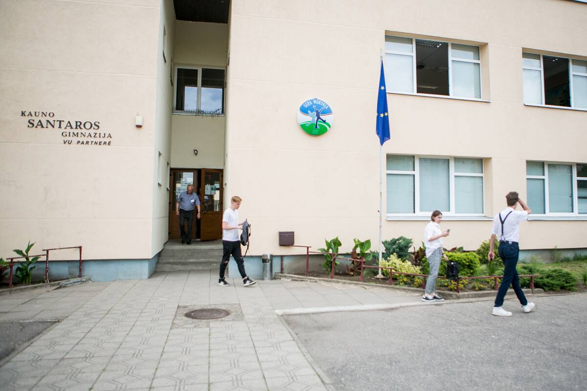 Vėl prasiveria „Santaros“ gimnazijos durys. Po egzamino abiturientė išeina gana rami, bet kalbant jaučiasi, kad streso buvo daug.