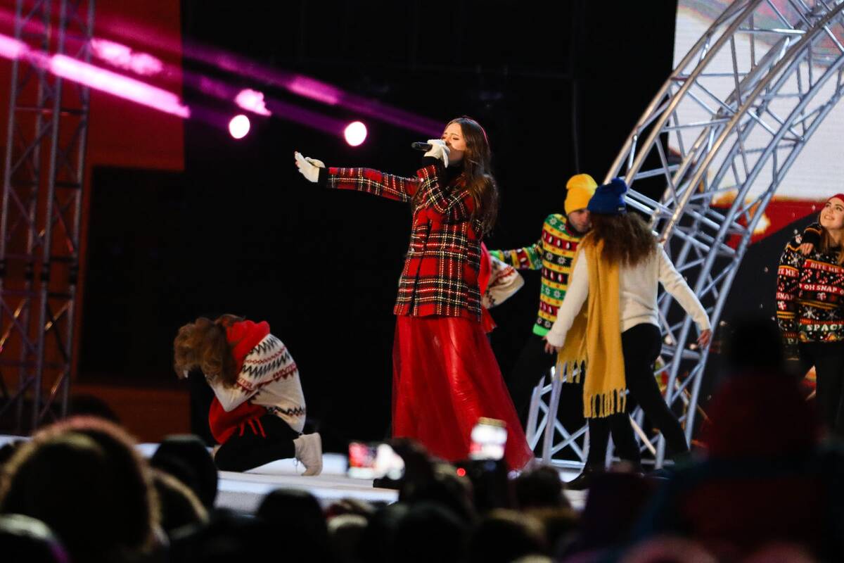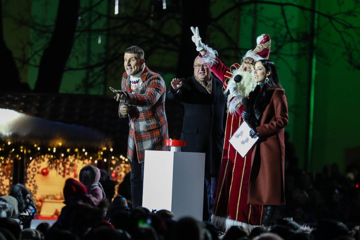 Kalėdų eglės įžiebimo šventinį koncertą pradėjo ant scenoje sumontuoto ekrano rodomas trumpas filmukas su kalėdinio miestelio statymo akimirkomis.