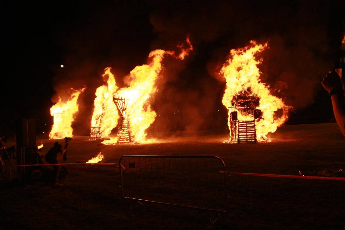 Nemuno ir Neries santakoje į dangų iššovė pagrindinis vakaro akcentas. Degančių skulptūrų ugnies misterija ir fejerverkas užbūrė kauniečius ir privertė bent laikinai pamiršti visas problemas ir tiesiog pasimėgauti įspūdingu reginiu. Sukurtą grožį sutvirtino šviesos atspindžiai vandenyje.