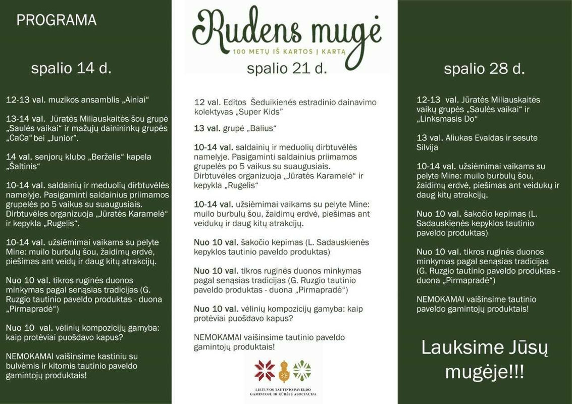 Mugės svečių laukia gyvos muzikos koncertai, nemokamos edukacinės dirbtuvėlės, kurių metu vaikai kartu su tėvais bus kviečiami išbandyti saldainių gamybą, meduolių dailinimą ar tikros ruginės duonos minkymą. Taip pat vyks parodomosios šakočio kepimo programos, o Lietuvos žolininkės dalinsis patarimais, kaip išlikti sveikam ir nesusirgti žvarbų ir permainingą lietuvišką rudenį. Mugės svečiai ir dalyviai turės galimybę nemokamai pasigaminti Vėlinių kompozicijas, kuriomis papuoš artimųjų kapus. Renginio dalyvių taip pat lauks nemokamos tautinio paveldo gamintojų vaišės ir smagūs užsiėmimai vaikams.