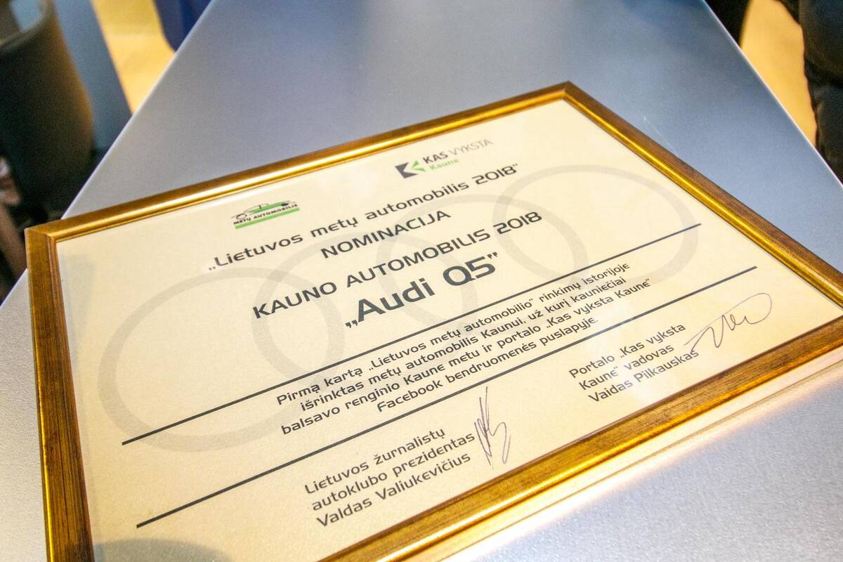 Ketvirtadienio popietę Kauno „Audi“ centre „Autojuta“, įsikūrusiame Chemijos g. 8, buvo įteiktas apdovanojimas šio prekės ženklo atstovams. Renginyje dalyvavo konkurso „Lietuvos metų automobilis 2018“ organizuojančio Lietuvos žurnalistų autoklubo prezidentas Valdas Valiukevičius, portalo Kasvykstakaune.lt direktorius Vaidas Pilkauskas, „Audi“ pardavimų vadovas Vytautas Švedas ir kiti svečiai.