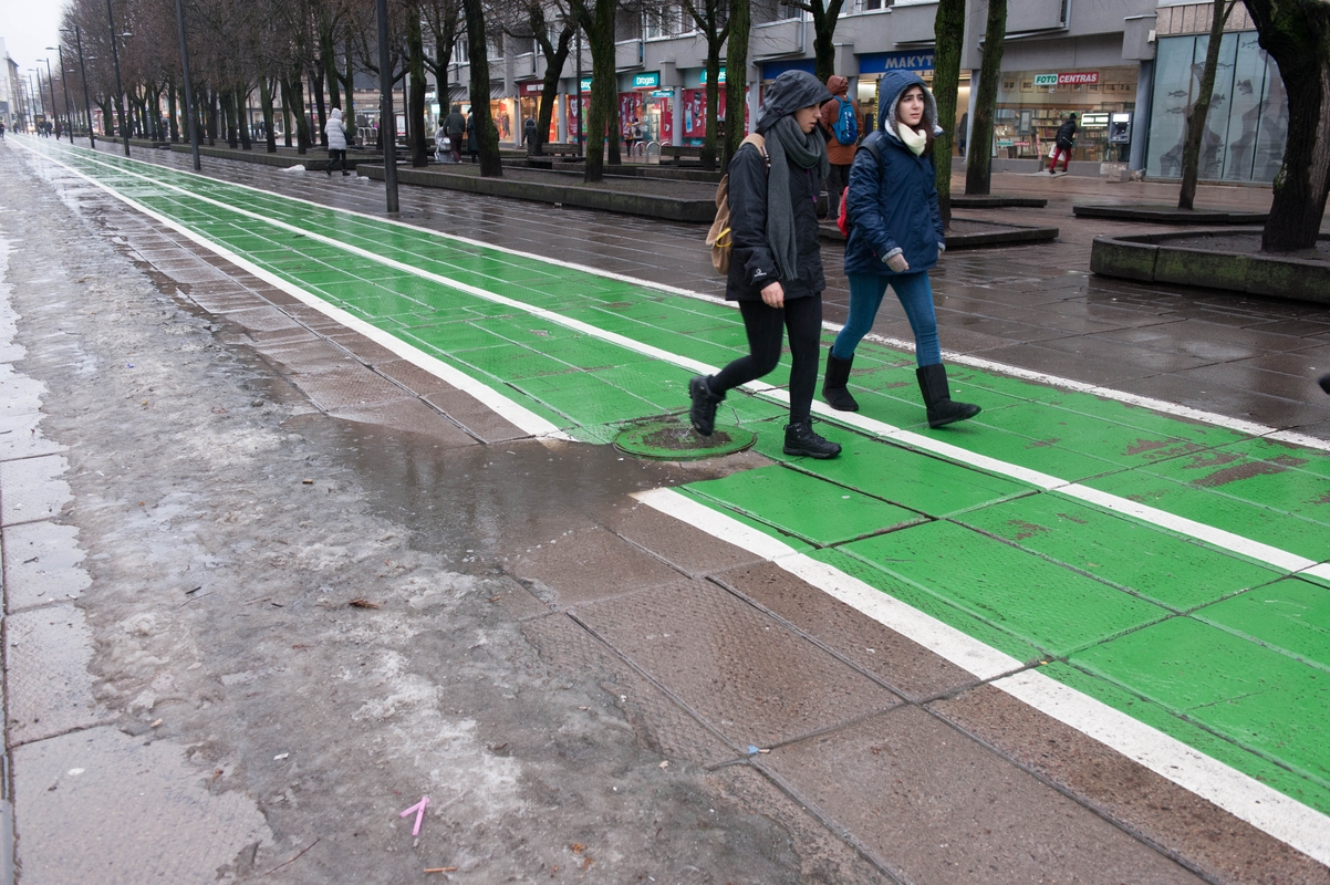 Laisvės alėjoje matyti, kaip tiesiog ištisomis vietomis šviečia plytelės, o žalia dviračių juosta atrodo lyg šimtmetį nebūtų mačiusi dažų.