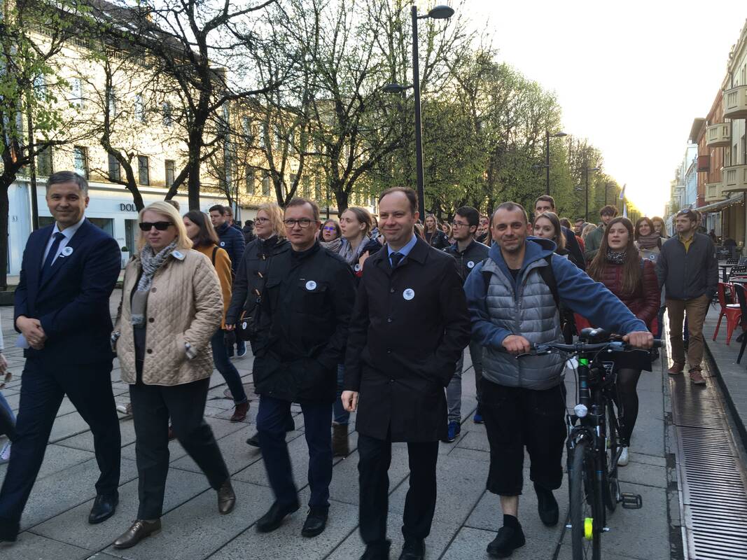 Pagrindine Kauno pėsčiųjų gatve kartu žygiavo ir sveiktos apsaugos ministras A.Veryga, kuris pats prieš tampant Vyriausybės atstovu, buvo mediku. Jis kolegoms linkėjo sveikatos ir tikino, kad daromi pokyčiai sulaukia įvairių reakcijų, tačiau vis tiek tikima, kad pokyčiai bus į gerą.