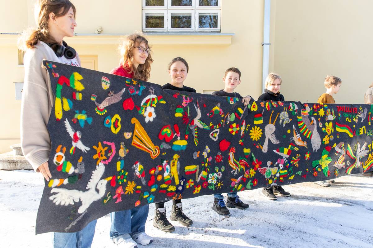 „Kilimą nusprendėme puošti tautiniais motyvais. Rinkomės įvairių spalvų vilną, bet viską sujungė geltona, žalia ir raudona“, – Kauno dailės gimnazijos mokytoja Dovilė Rukšėnienė skaičiavo, kad buvo sunaudota apie 1 kg vilnos, kuri virto paukšteliais, kanklėmis, širdelėmis, gėlėmis ar jautriais, Lietuvai skirtais, žodžiais.