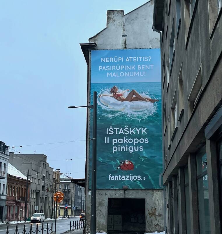 „Nerūpi ateitis? Pasirūpink bent malonumu! Ištaškyk II pakopos pinigus“, – skelbė erotinėmis prekėmis prekiaujančios platformos reklama.
