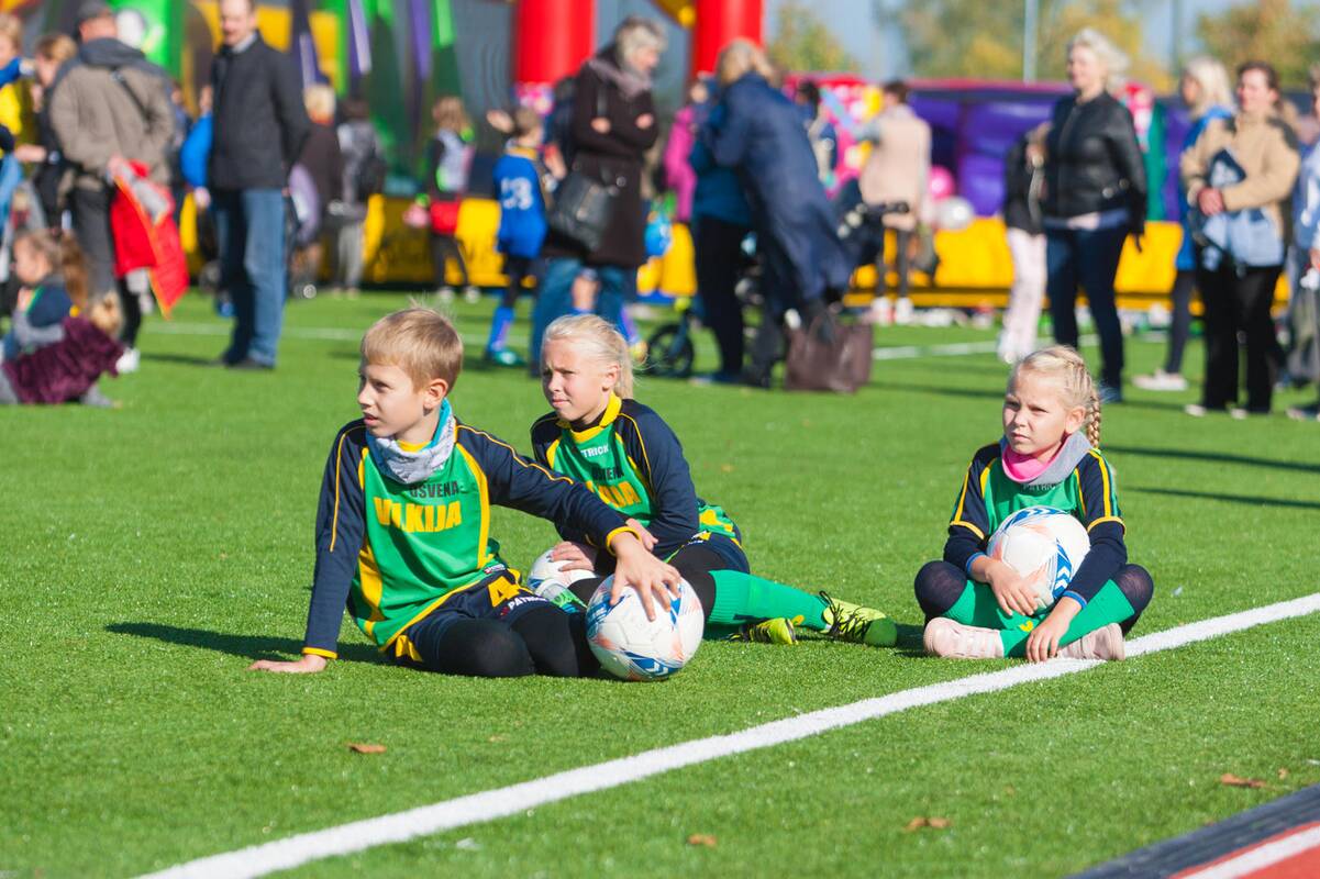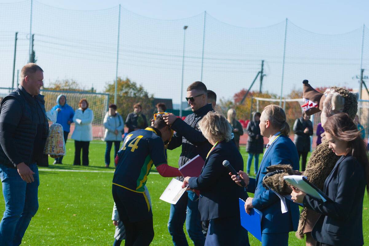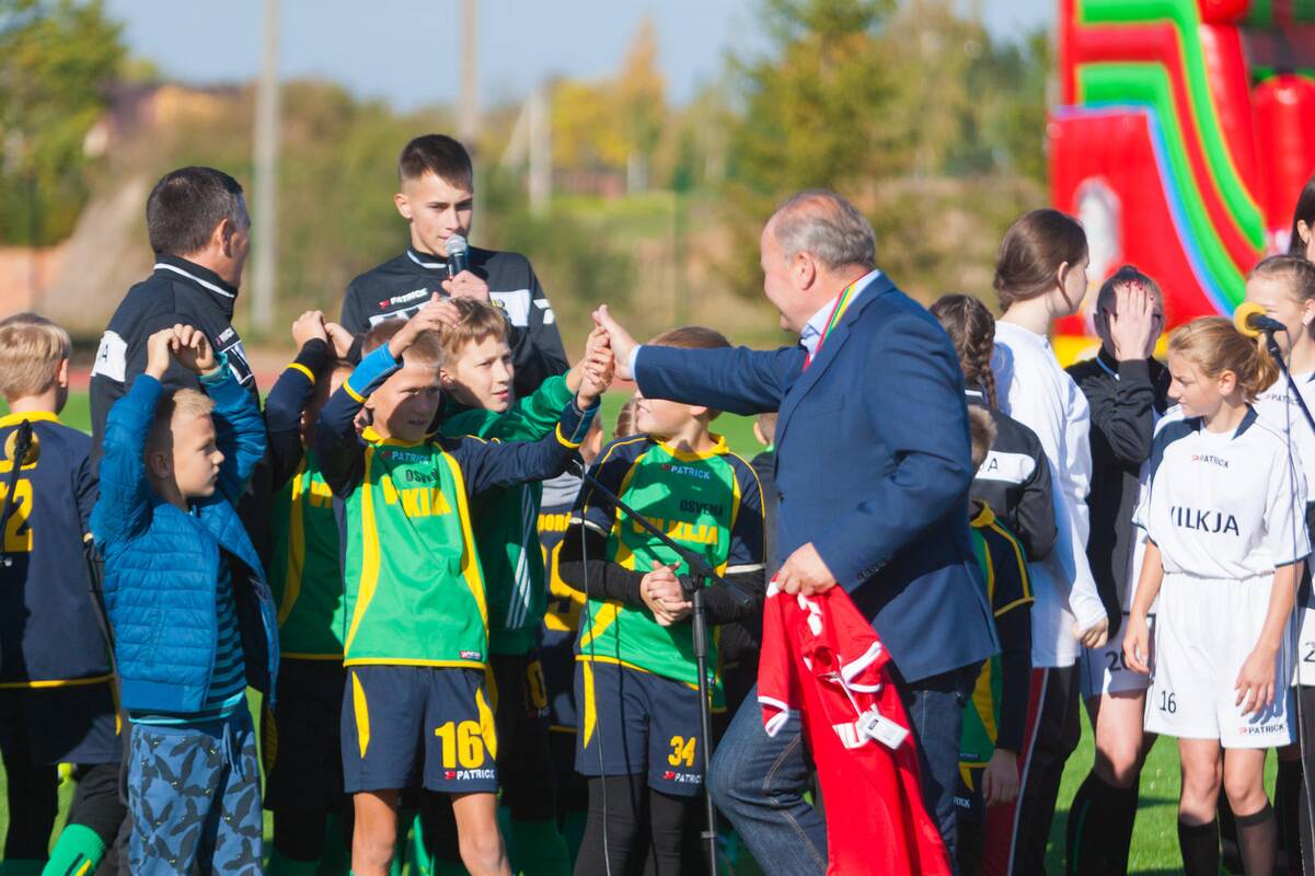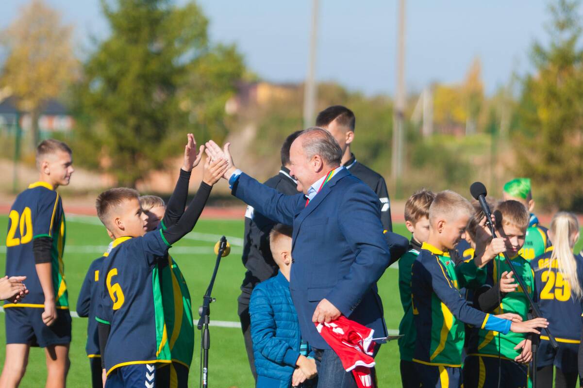 Spirti pirmųjų įvarčių į naujo stadiono vartus pakviesti Kauno rajono meras Valerijus Makūnas ir mokyklos direktorius Antanas Švedas.