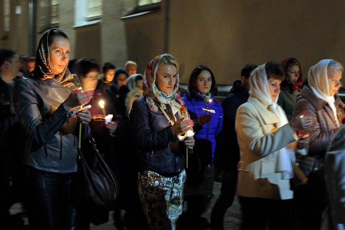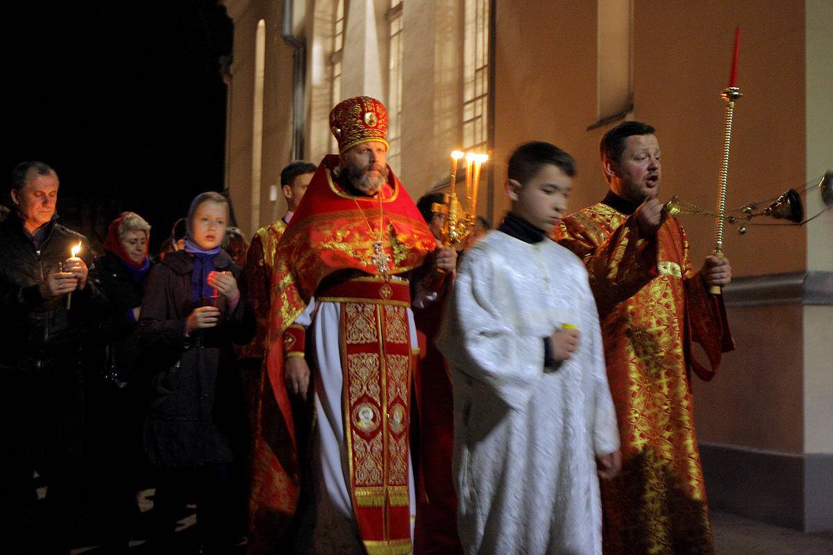 „Christos voskrese!“ („Kristus prisikėlė!“), – senąja slavų kalba gerąją žinią tikintiesiems šiąnakt po vidurnakčio dviejose Kauno šventyklose skelbė Rytų krikščionių bažnyčios dvasininkai – raudonos ir aukso spalvos rūbais pasipuošę stačiatikių šventikai ir juodais rūbais vilkintys sentikių ganytojai. Stačiatikiai gerąją žinią išgirdo skelbiamą visiems susirinkusiems šventykloje bendrai, sentikių cerkvėje dvasiškis ją skelbė prieidamas prie kiekvieno tikinčiojo.