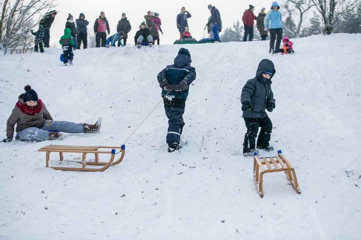 Jau priešpiet kauniečiai su šeimomis patraukė ieškoti vietų, nuo kurių būtų galima pasileisti rogutėmis. Vieni liko čiuožinėti nuo kalniukų savo rajono parke, kiti nepatingėjo nuvažiuoti iki Lampėdžio ežero skardžių ar Kauno marių.