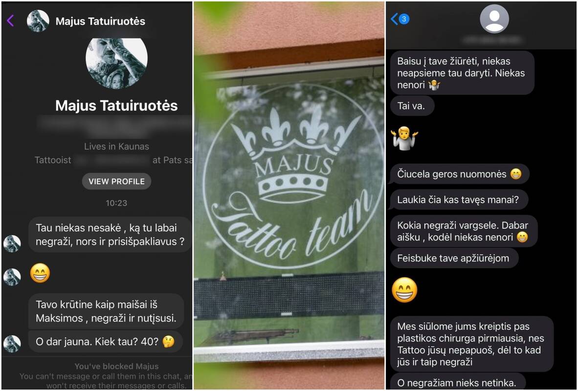 "Tau niekas nesakė, kad tu labai negraži, nors ir prisišpakliavus? Tavo krūtinė kaip maišai iš "Maximos" – negraži ir nutįsusi. O dar jauna. Kiek tau? 40?" (kalba taisyta – aut. past.), – taip skambėjo privačios žinutės, siųstos iš "Facebook" paskyros, pavadintos "Majus Tatuiruotės".