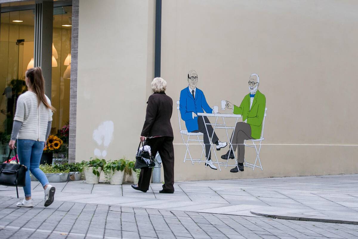 Šiomis dienomis ant neseniai restauruoto Laisvės al. 38 pastato fasado atsirado naujas gatvės meno kūrinys. Jame pavaizduoti du prie stato susėdę vyrai – miesto vadovas V. Matijošaitis ir jam kritikos negailintis architektas A. Karalius. Ant piešto staliuko – kavos puodeliai. Kauniečiai užfiksavo, kad kelias dienas ties nauju piešiniu buvo pastatytas ir staliukas su kėdėmis, tad praeiviai galėjo prisėsti šalia piešinio herojų, įsiamžinti ir pakalbėti apie svarbius miesto reikalus. Pagrindinė piešinio idėja – kviesti Kauno valdžią diskutuoti su kauniečiais.
