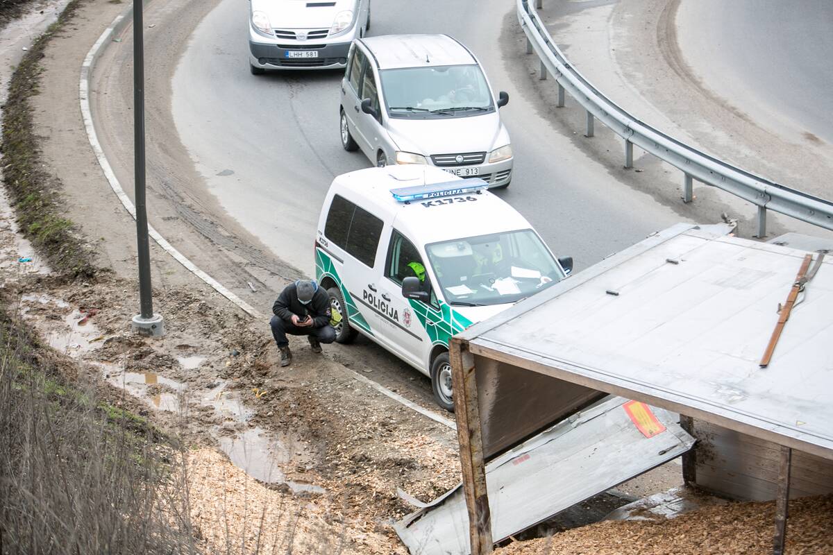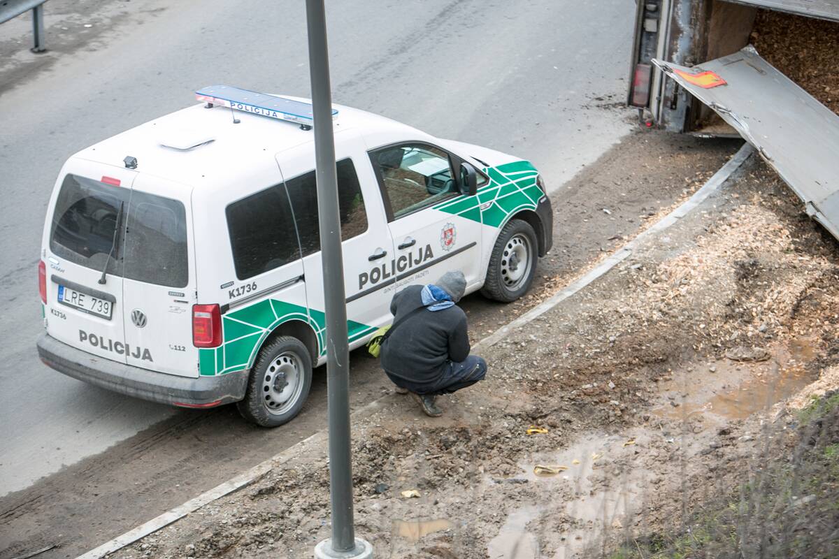 Primename, kad balandžio 6-osios popietę ties Amalių tuneliu vilkikas „Volvo“ ir priekaba liko gulėti ant šono, pabiro vežtos pjuvenos. Jos nuklojo dalį teritorijos šalia kelio, važiuojamojoje kelio dalyje kyšojo transporto priemonės ratai.