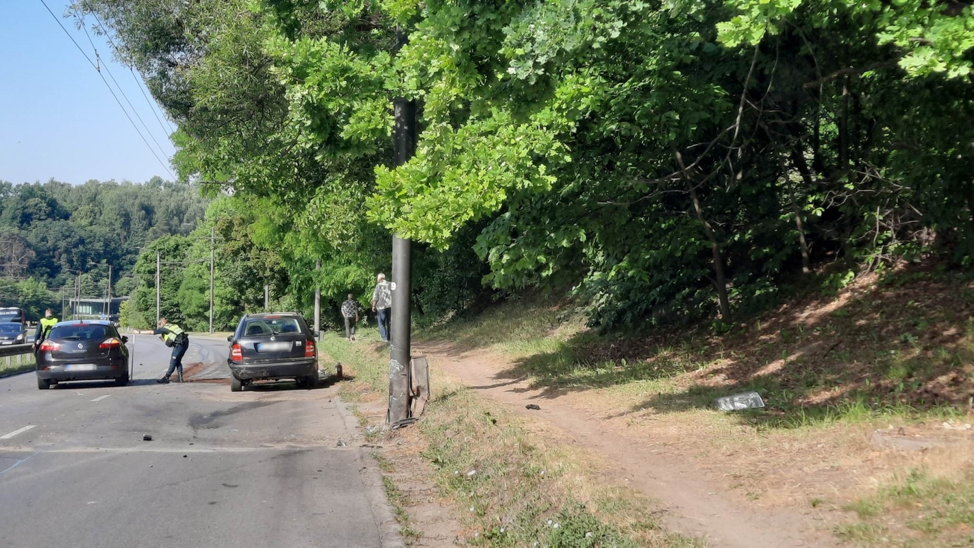 Smūgis per avariją buvo toks stiprus, kad vieno automobilio priekio visiškai neliko. Apgadintas stulpas.