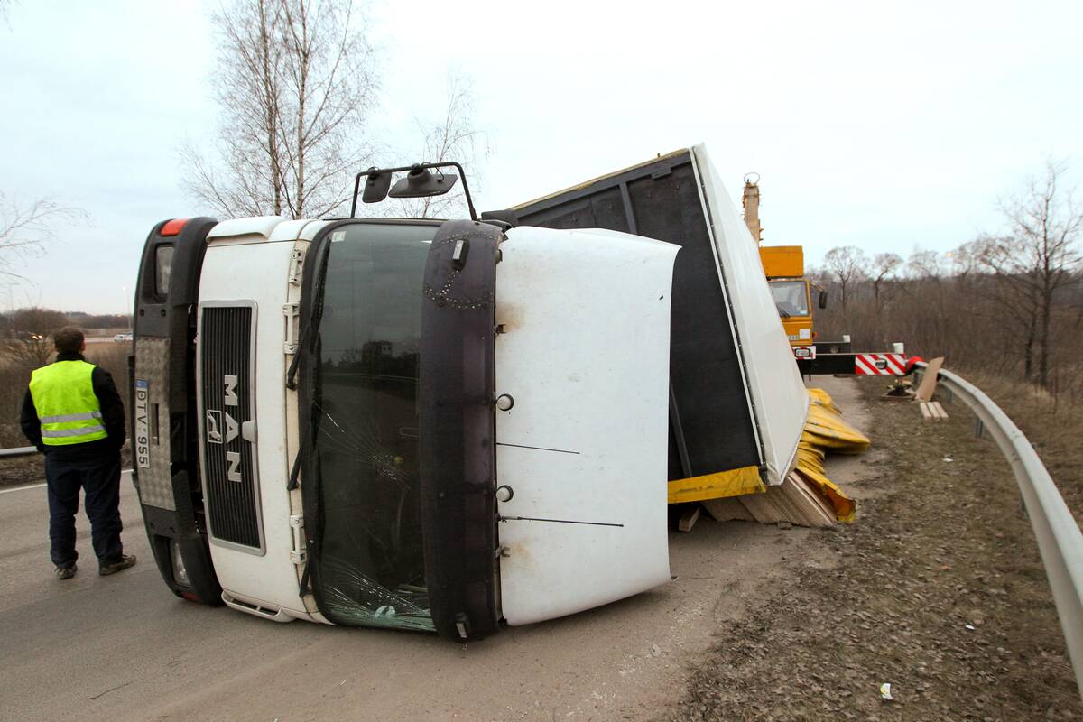 Antradienį Kaune, ties išvažiavimu į magistralinį kelią Vilnius-Kaunas-Klaipėda, nepasisekė vilkiko vairuotojui. Vyro vairuojama transporto priemonė apvirto ant šono Savanorių prospekte, važiuojant į kelią Klaipėdos kryptimi.