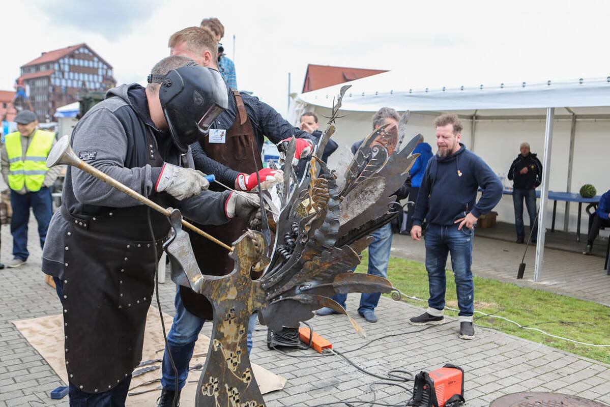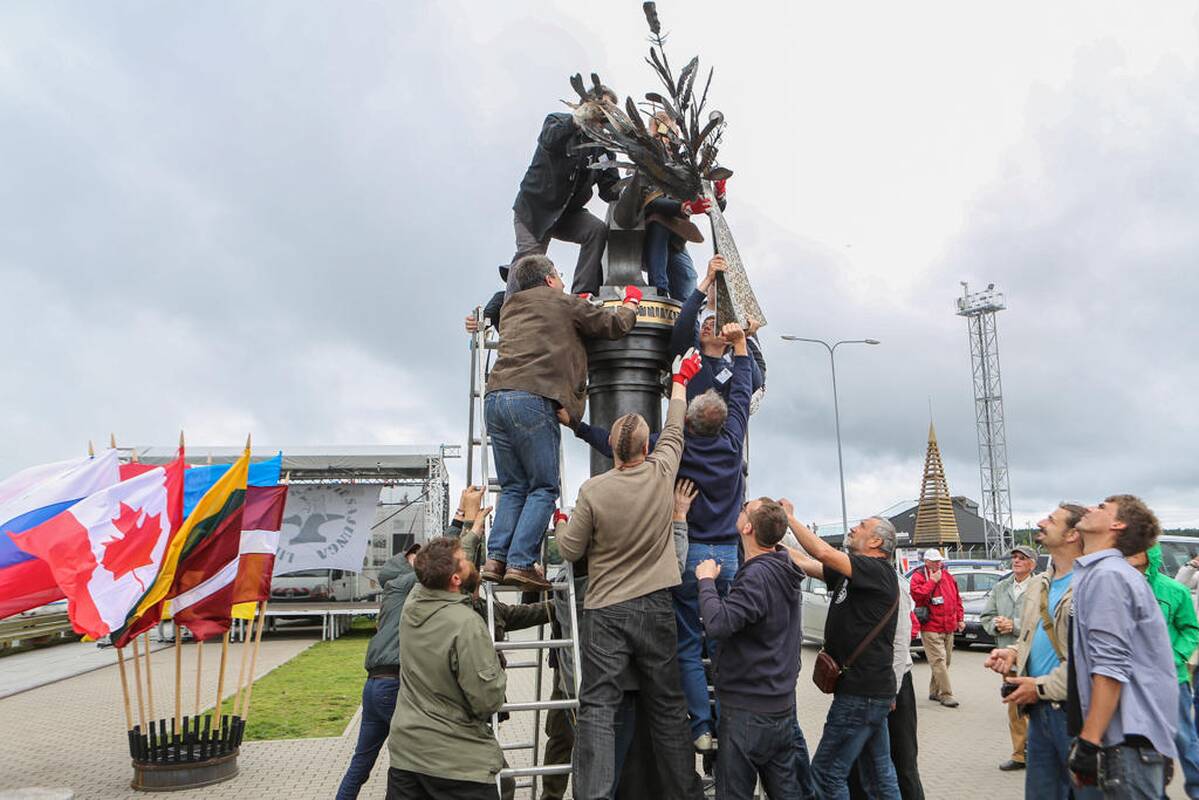 Sekmadienio popietę vyrai sukibo ir gerokai per 100 kilogramų sveriančią metalinę skulptūrą užkėlė ant kelių metrų aukščio postamento, jį sudarė kolona bei tikras kalvio priekalas. Žiūrovai atsidėkojo kalviams už unikalų reginį plojimais.