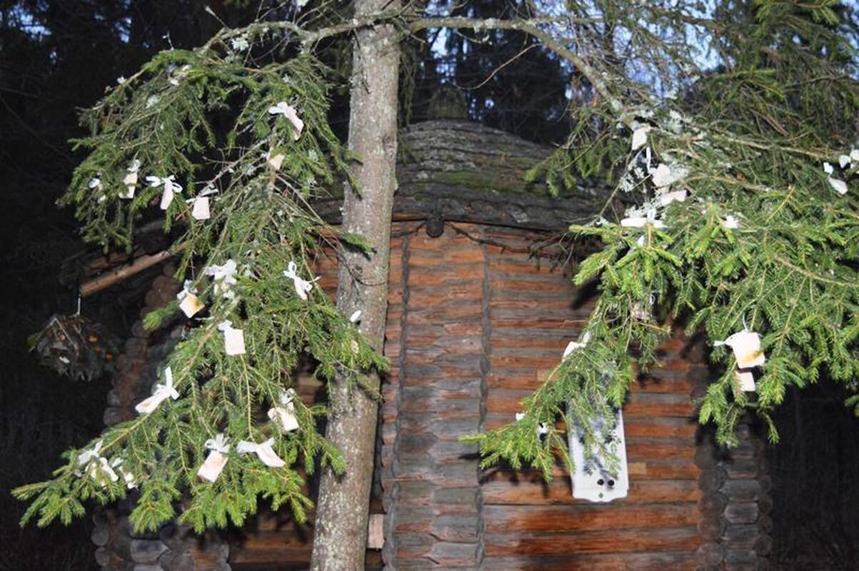 Pasirūpinta ir sparnuočiais – specialiai jiems greta kompozicijos augančių eglių šakos padabintos šventiškai papuoštais lašinių griežinėliais.