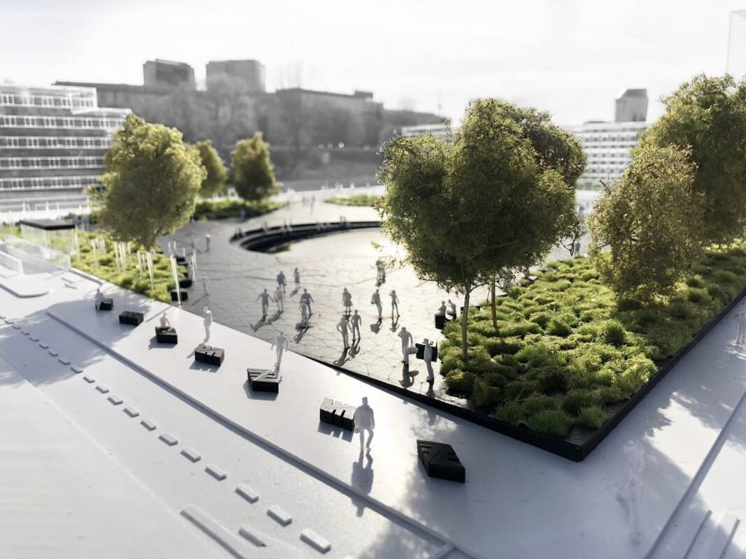 Erdvę bus galima suskaidyti į kelias skirtingas zonas – įrengti lauko kavines, amfiteatrą ar sceną.