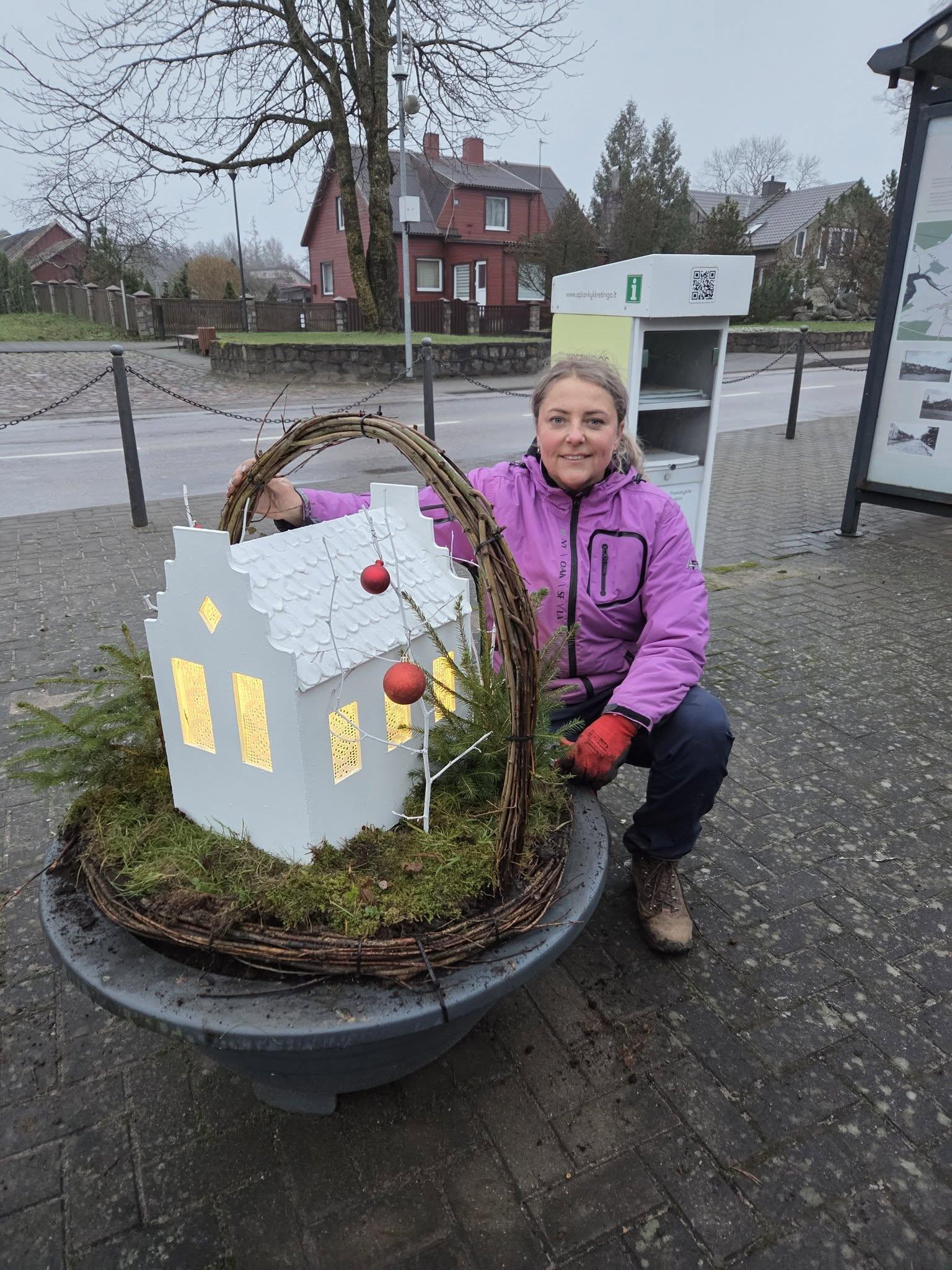 Kalėdinės puošmenos atsirado ir prie centrinės gatvės. Bendruomenės moterys dar papuošė ir gėlių klombas.
