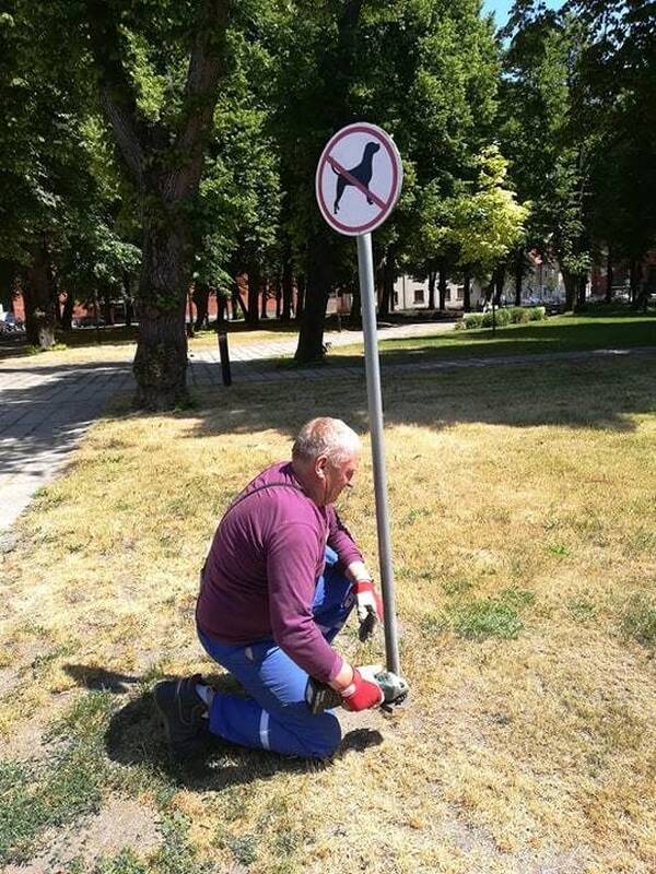 Įdomesnė situacija – K.Donelaičio aikštėje. Šioje viešojoje erdvėje rastas nelegaliai pastatytas šunis vedžioti draudžiantis ženklas.