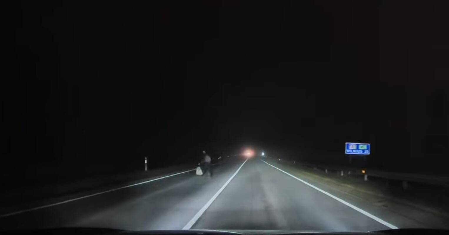 Kitas vyriškis įkėlė vaizdo įrašą, kuriame matyti staiga į gatvę išbėgęs vyras. Kadangi gatvė neapšviesta, o pėsčiasis be atšvaitų, jį vairuotojui pavyko pastebėti tik laimingo atsitiktinumo dėka.