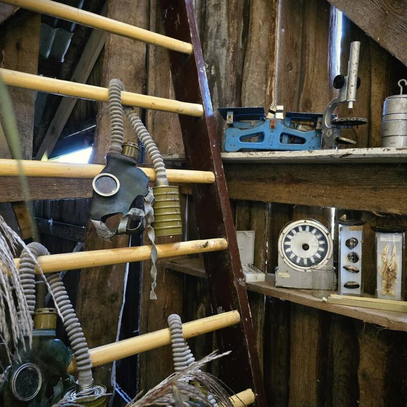 Po malkinės stogu sau vietą rado ir senoviniai buities rakandai – verpimo rateliai, darbo įrankiai. Šalia atsidūrė senos knygos, žemėlapiai.