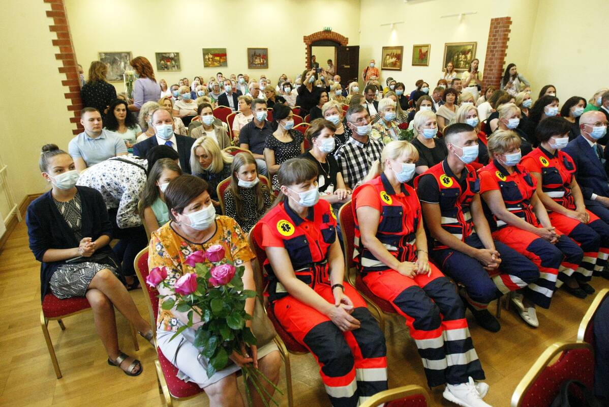 "Labai dažnai sakoma, kad dirbame ne dėl apdovanojimų. Tai aišku, kad ne. Bet apdovanojimai arba tam tikri simboliai vis dėlto yra svarbūs. Nes tempas yra beprotiškas, viskas bėga labai greitai, daugybė dalykų išsitrins, užsimirš, užsiklos kitais. Jeigu mes tam tikrų dalykų nesusimboliname, neatsiranda nieko, ką gali pamatyti, paskaityti, pajausti, labai daug tiesiog pasimiršta. Nors COVID-19, manau, nepasimirš. Jūsų vaidmuo turi būti nors truputį įprasmintas", – dėstė A.Veryga.