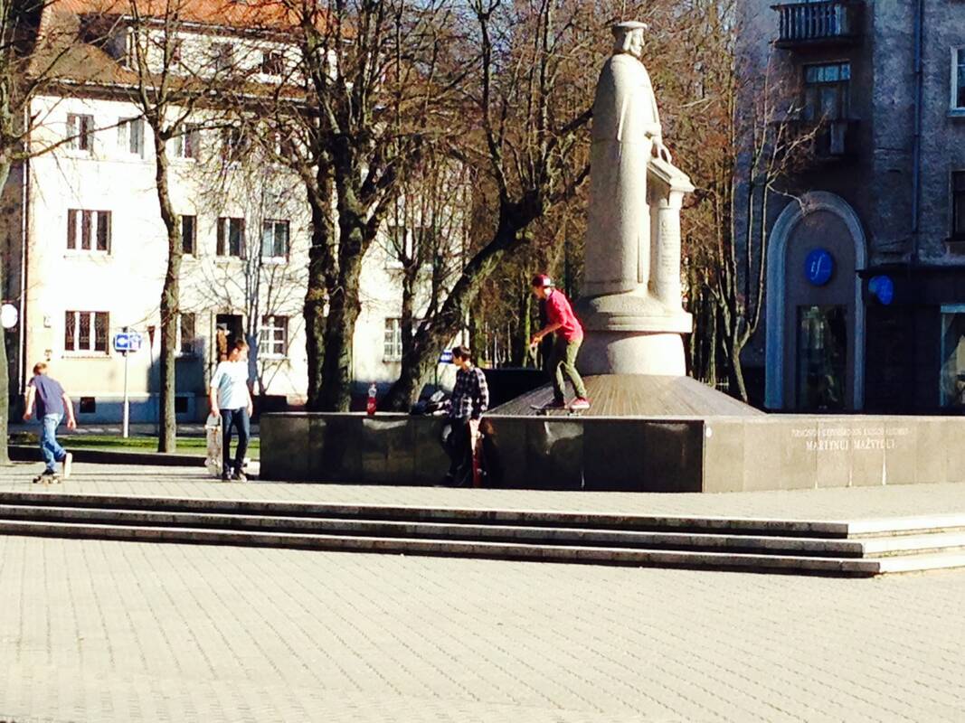 Dienraščio "Klaipėda" skaitytojas ant M.Mažvydo paminklo važinėjančius riedlentininkus užfiksavo šeštadienio popietę. Vyro akį patraukė ir nudaužyti, suskaldyti bei tepalais išterlioti Lietuvininkų aikštėje esantys borteliai.