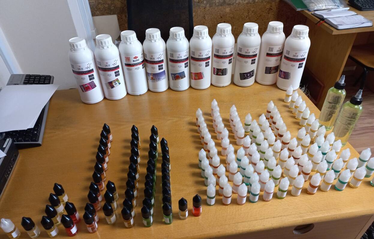 Jonyno gatvėje esančiame bute Veiklos skyriaus pareigūnai aptiko įspūdingą kiekį, įtariama, aromatizuoto koncentrato bei kitų cheminių medžiagų, elektroninėms cigaretėms užpildyti.