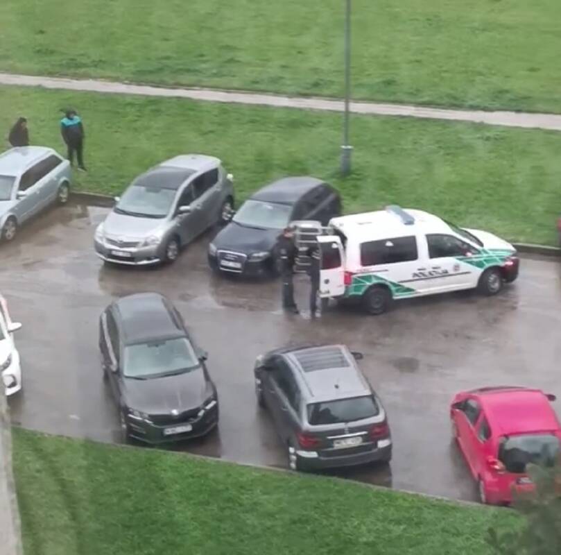 Policijos ekipažą savo kieme užfiksavo Kniaudiškių gatvės gyventojai, vaizdine informacija apie įvykį pasidaliję feisbuke.