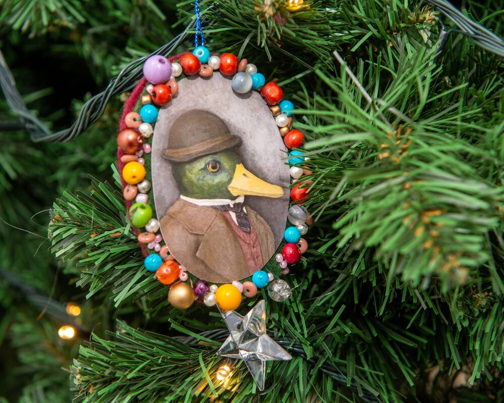 Moteris demonstruoja eglutės žaisliukus, sukurtus iš šiaudinio sodo likučių ir dekoruotus vadinamuoju bižuteriniu laužu – blizgiais karoliukais, auskarų likučiais ir pan. Tokio žaisliuko kūryba – kiekvieno improvizacija. Pakabinti ant eglutės tokie žaisliukai atrodo labai puošniai.