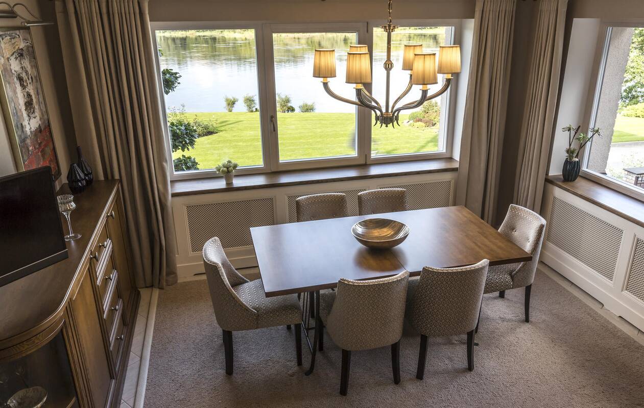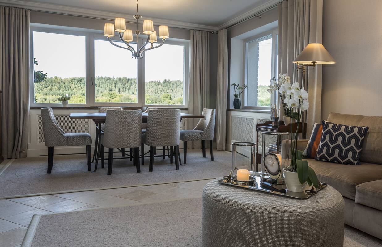 „Siekiant suteikti klasikinio elegantiškumo ties lubomis naujai išklijuoti karnizai. Sušildyti valgomojo ir svetainės erdvę padeda vilnoniai kilimai. Kartu jie funkciškai atskiria šias zonas. Virtuvė gana siaura ir gerai matoma iš svetainės, tad ant vienos sienos pakabintas dekoratyvus veidrodis, vizualiai didinantis patalpą“, – teigia architektė. Svetainei erdvumo suteikia šviesios spalvos, žemesni baldai.