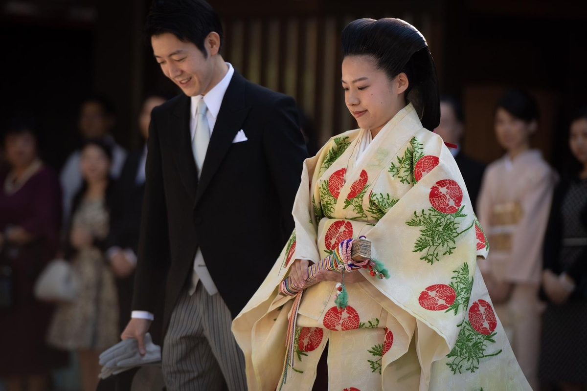 Princesei buvo padaryta Heian laikotarpio imperatoriškojo dvaro stiliaus šukuosena. Ji vilkėjo puošnų tradicinį kimono su raudonais ir žaliais raštais, o jaunikis – fraką. Vėliau princesė persirengė raudonu kimono.