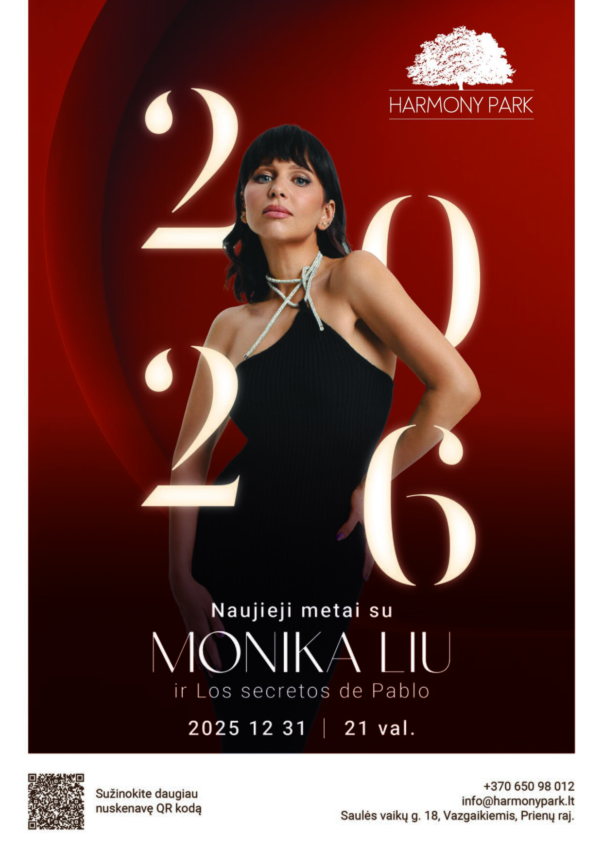 Gruodžio 31 d. netoli Birštono, Nemuno kilpų regioniniame parke, įsikūręs elegantiškas 5+ žvaigždučių poilsio ir pramogų kompleksas „Harmony Park“ kviečia į išskirtinę Naujųjų metų šventę. Jos programoje – aukščiausio lygio kulinarija ir konditerija, gyva muzika, šventinė atmosfera, o naujametės nakties kulminacija taps specialiai šiai progai surengtas Monikos Liu koncertas kartu su Lotynų Amerikos ritmų grupe „Los Secretos de Pablo“.