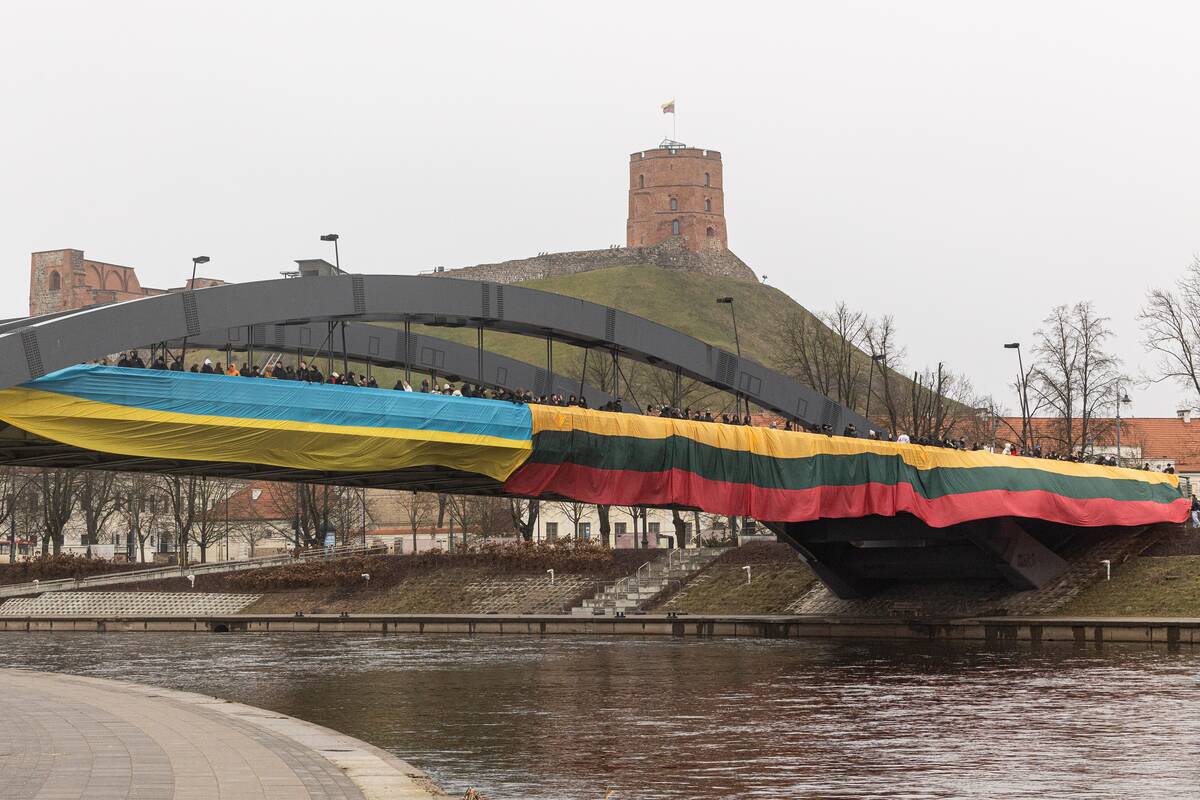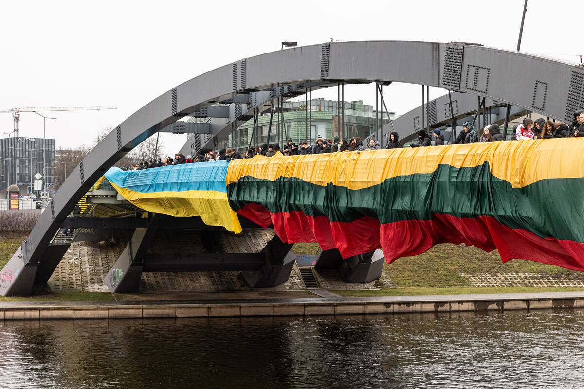 Renginio metu Tarptautinės Ukrainos mokyklos mokiniai ir darbuotojai ant tilto išskleidė 50 metrų ilgio Ukrainos ir Lietuvos vėliavas.
