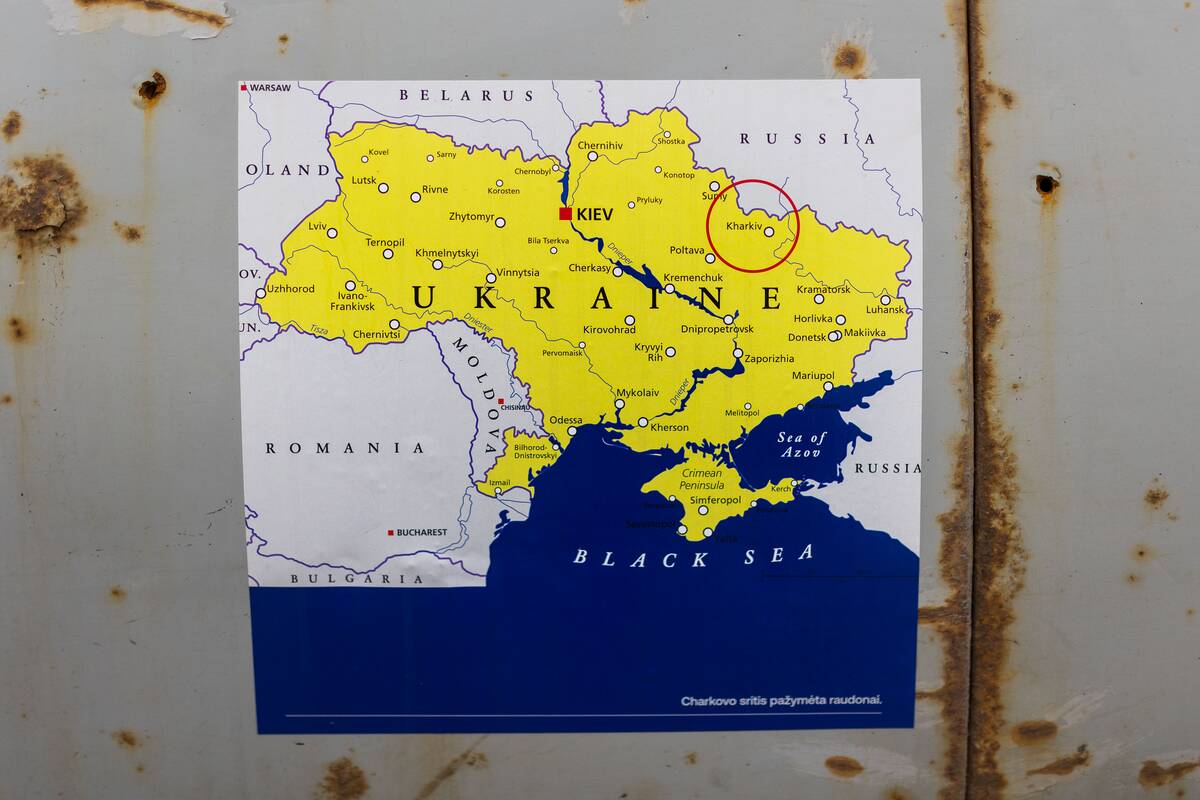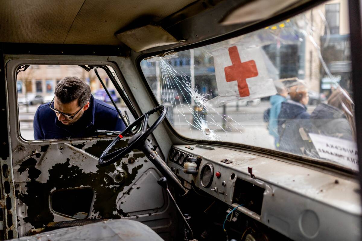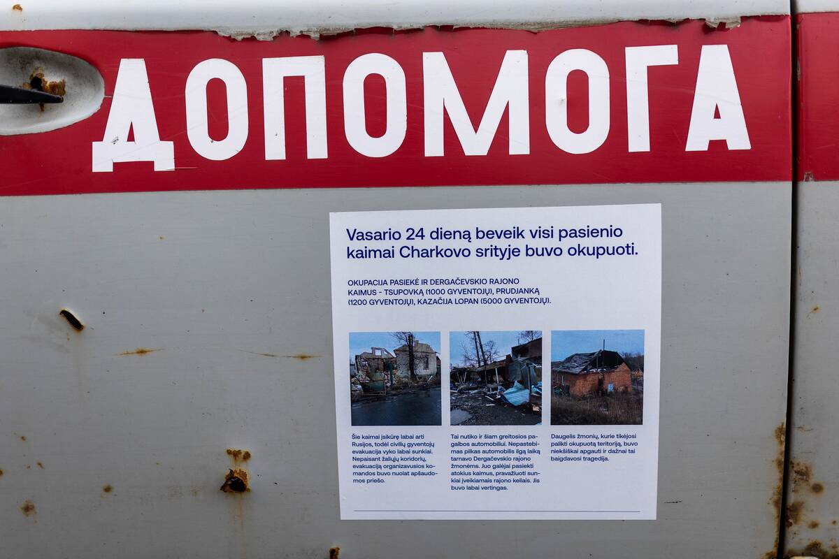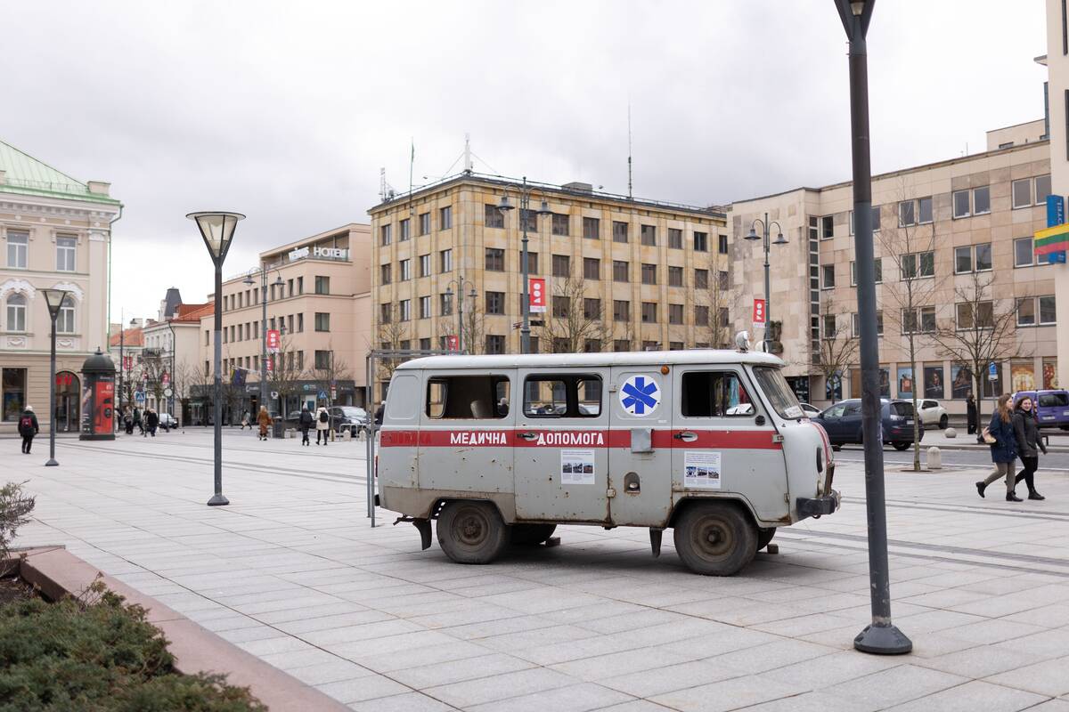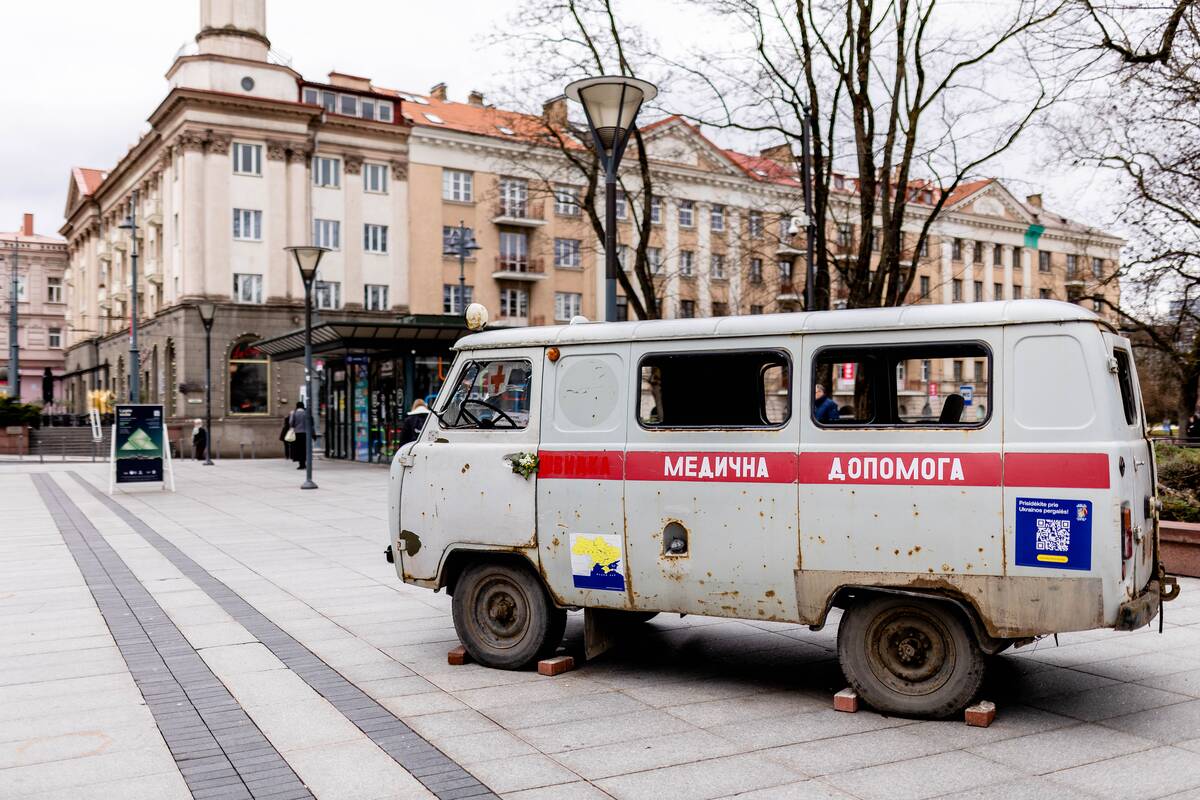 Vilniuje, Vinco Kudirkos aikštėje, eksponuojamas kulkų ir sviedinių nuolaužų apgadintas Charkivo srities Dergačių centrinės ligoninės medikų automobilis.